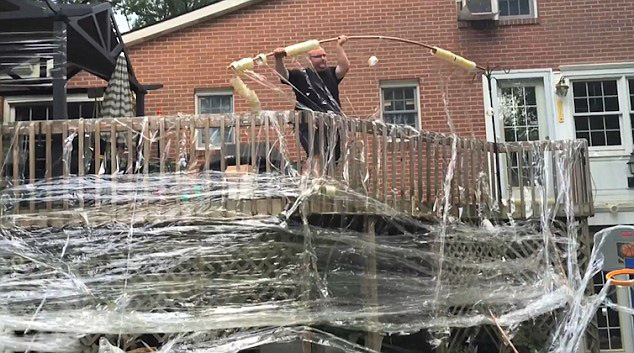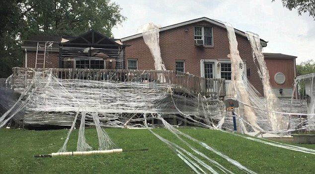 喬納森邀請(qǐng)朋友一起來(lái)幫忙完成這個(gè)“大工程”。他們將約10卷膠帶套在一個(gè)木棍上提高效率,然后開(kāi)始漫天地撕扯、纏繞,將房子的外圍、屋頂、甚至是廁所里都貼滿(mǎn)了膠帶。