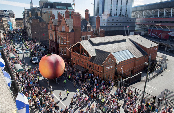 此次慶典活動最引人注目的是一個巨型的桃子,該巨桃模型出自羅爾德兒童小說《飛天巨桃歷險(xiǎn)記》。高達(dá)9米多的巨桃模型穿城而過,男女老少爭先觀看,擁擠的人群洋溢著輕松快樂的氣息。與此同時,其它以該劇組家的作品人物為原型的慶;顒油瑯右步o人們帶來了巨大的驚喜和歡樂。