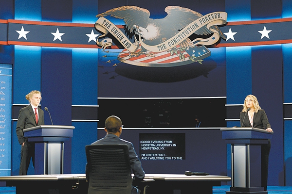 美國總統(tǒng)大選首場辯論當?shù)貢r間26日晚在紐約霍夫斯特拉大學舉行,圖為當?shù)貙W生在辯論現(xiàn)場預演。