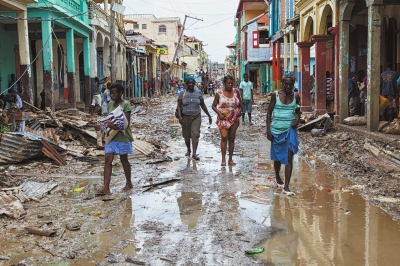 10月6日在,海地?zé)崂酌状,民走在颶風(fēng)過后積水的街道上。新華社發(fā)