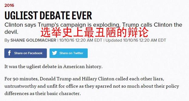 有媒體形容這是“美國(guó)選舉史上最丑陋的辯論”。文中指出,在這場(chǎng)90分鐘的辯論中,特朗普和希拉里互相指責(zé)對(duì)方撒謊,以及如何不值得信賴和不適合總統(tǒng)一職,他們更多地去對(duì)對(duì)方進(jìn)行人格攻擊而非談?wù)搱?zhí)政理念的差異。