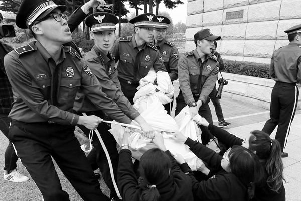 26日,韓國(guó)學(xué)生在國(guó)會(huì)外抗議,要求彈劾總統(tǒng)樸槿惠,有些人因此被警察拘留。