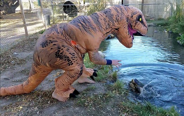 【環(huán)球網(wǎng)綜合報(bào)道】據(jù)英國(guó)《每日郵報(bào)》10月26日?qǐng)?bào)道,在美國(guó)科羅拉多州的鱷魚(yú)爬行動(dòng)物園,一名男管理員把自己打扮成“霸王龍”,手里還拿著一條魚(yú)戲弄水中大鱷魚(yú),好在這條名為莫里斯(Morris)的鱷魚(yú)經(jīng)過(guò)訓(xùn)練,未對(duì)該男子造成傷害。