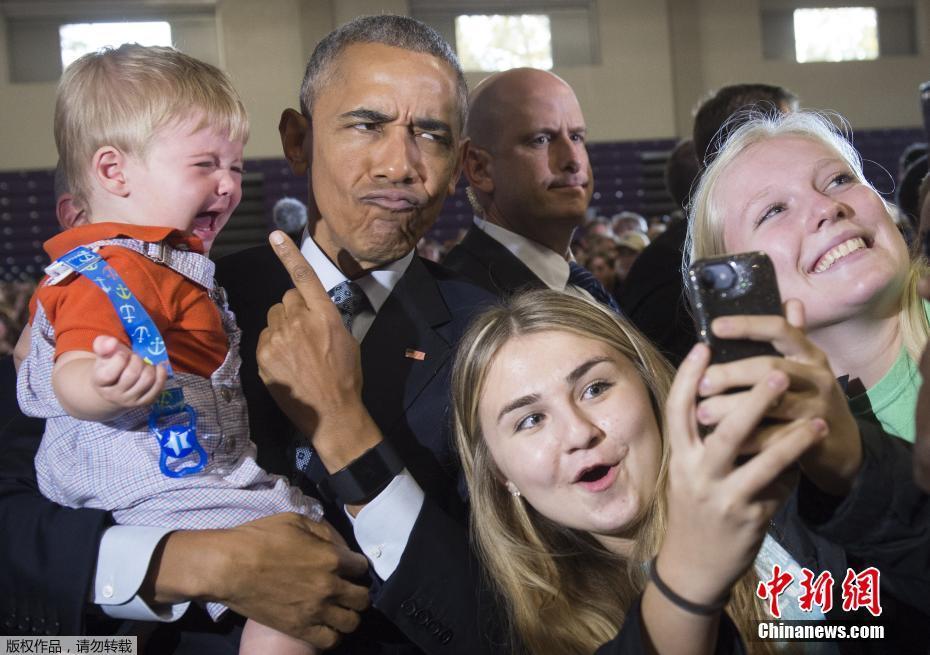 當?shù)貢r間2016年11月1日,美國俄亥俄州,總統(tǒng)奧巴馬舉行集會演講,為民主黨總統(tǒng)候選人希拉里拉票。現(xiàn)場的一名小朋友吸引了奧巴馬的注意,他再次展示了自己對于孩子的親和力,抱著萌娃嘟嘴和現(xiàn)場民眾合影,只是這名寶寶并不是太開心,在總統(tǒng)懷里放聲大哭。