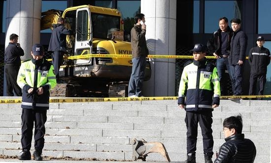 警方說,這名男子姓鄭(音譯),現(xiàn)年45歲,來自首爾以南大約360公里的淳昌郡。當(dāng)天凌晨3時(shí)左右,他開著一輛卡車,裝著那臺挖掘機(jī),停在大檢察廳附近。8時(shí)20分左右,鄭某駕駛挖掘機(jī)沖破護(hù)欄,直上臺階,一直開到樓門口才被攔下。