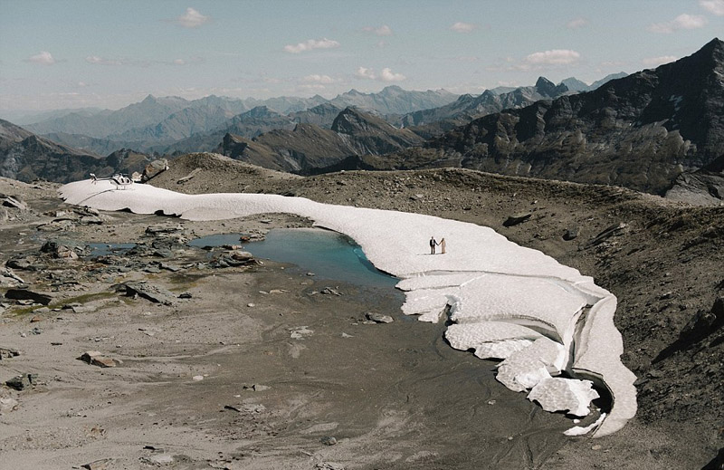 照片中,新郎新娘時而站在一條白色的冰帶上,手牽手展露出幸福的微笑;時而站在山間,深情對望,畫面十分唯美。為了達到更好的拍攝效果,羅斯還專門乘坐直升機在空中捕捉婚禮的精彩瞬間,如新娘向伴娘們扔花束等場景。
