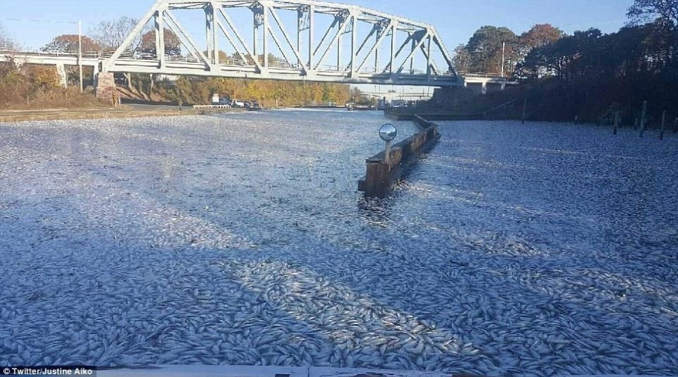 本周,美國(guó)紐約長(zhǎng)島的一條運(yùn)河上漂浮著上萬(wàn)條死魚(yú)。無(wú)數(shù)的鯡魚(yú)尸體密密麻麻地漂浮在水面,閃著銀光,遠(yuǎn)看就像是運(yùn)河被冰凍住了一樣?茖W(xué)家稱這現(xiàn)象前所未有,有當(dāng)?shù)厝税堰@稱為一次“魚(yú)類天啟”(fishpocalypse)。