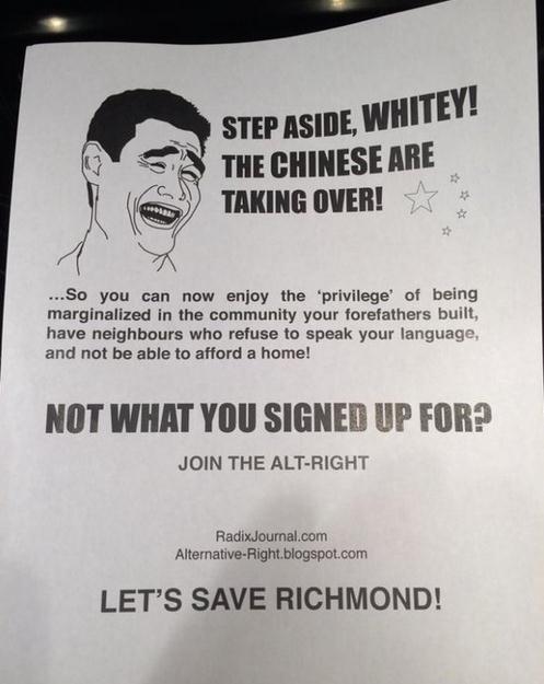 報(bào)道稱,大溫哥華地區(qū)列治文市(一個(gè)擁有大量華裔人口的城市)的一些居民在他們的郵箱里面發(fā)現(xiàn)了一些傳單,該傳單上鼓動(dòng)白人加入一個(gè)名為"Alt-Right"的運(yùn)動(dòng),號(hào)召白人“一起對(duì)抗華人群體,拯救被華人搶占的列治文市”。