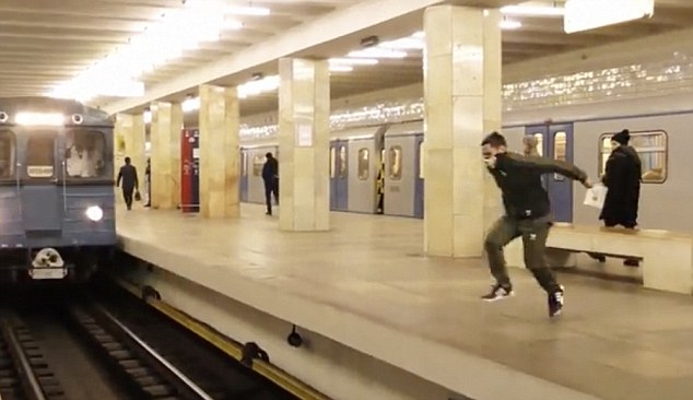 視頻中的這名男子看起來像是一名青少年,在整個拍攝過程中,他一直用圍巾遮住面部。在視頻開頭,該男子正坐在地鐵站的長椅上系鞋帶;疖囬_始進站時,他立即沖到站臺上,待車身離他只有數(shù)米遠時縱身一躍,在空中翻了一個跟頭,然后又落在了另一側站臺上。
