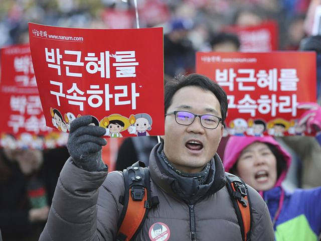 12月10日,抗議者舉著要求逮捕樸槿惠的標(biāo)語牌,向首爾市中心青瓦臺(tái)總統(tǒng)府方向走去。(新華/美聯(lián))