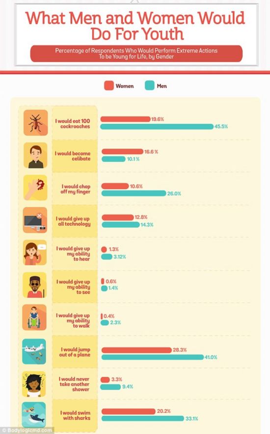此項(xiàng)研究的受試者共2000人,最引人注意的是他們對(duì)獲得“年輕”的回答。千禧一代,不論年紀(jì)多大,他們更想要一輩子年輕。研究人員詢問受試者,要是能一輩子年輕,會(huì)采取哪些極端措施?34.7%的人說他們會(huì)從飛機(jī)上跳下來(研究人員并沒有提示有無(wú)降落傘),32.5%的人愿意吃100吃蟑螂,31.2%的人愿意失去味覺,26.7%的人愿意和鯊魚一起游泳,18.4%的人愿意切下手指,13.5%的人愿意遠(yuǎn)離科技,13.4%的人愿意為此單身,只有少部分人(6.3%)說不再洗澡,2.2%的人愿意喪失聽力,1.6%的人愿意喪失走路的能力,1%的人愿意喪失視力。