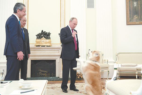 接受日媒采訪時,普京把日本送的秋田犬帶到現(xiàn)場。