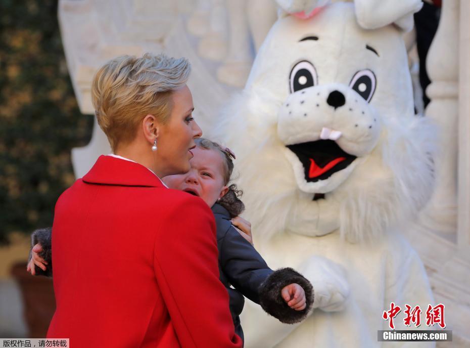 當?shù)貢r間2016年12月14日,摩納哥親王阿爾伯特二世與妻子夏琳王妃帶著龍鳳胎寶寶雅克小王子和加布里埃爾小公主在王宮出席官方圣誕樹典禮。小公主被現(xiàn)場的“兔子”嚇哭。