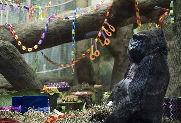 中新網(wǎng)12月25日電 據(jù)外媒報道,正當(dāng)大家歡度圣誕佳節(jié),美國哥倫布動物園暨水族館的大猩猩科洛(Colo)則喜迎她的60歲大壽?坡迨鞘澜缟系谝恢怀錾趧游飯@、美國最老的大猩猩,它已比大猩猩預(yù)期壽命長20年,至今兒孫滿堂。