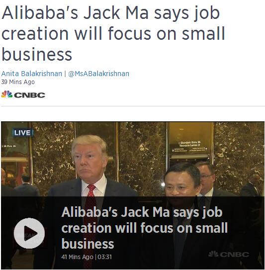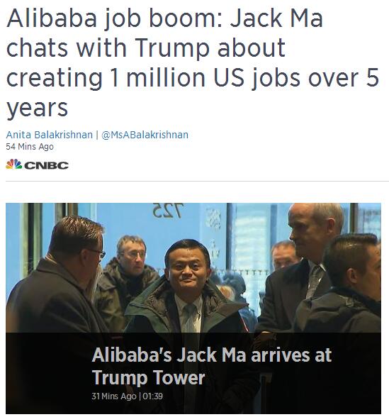 起初,CNBC援引消息人士的話稱,馬云此次會(huì)見(jiàn)特朗普,主要是聊阿里巴巴最新的美國(guó)擴(kuò)張計(jì)劃。這份計(jì)劃包括未來(lái)5年在美國(guó)創(chuàng)造100萬(wàn)就業(yè)崗位。CNBC顯然對(duì)此充滿期待,并將這個(gè)點(diǎn)當(dāng)做標(biāo)題。