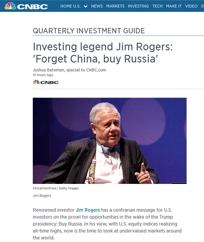 【環(huán)球網(wǎng)報(bào)道 記者 譚福榕】“忘掉中國(guó),買俄羅斯吧!”這是美國(guó)CNBC關(guān)于美國(guó)投資大鱷吉姆·羅杰斯最新論斷的報(bào)道。羅杰斯在采訪中對(duì)特朗普時(shí)代的美俄關(guān)系回暖以及由此帶來的商機(jī)表示了樂觀,與此同時(shí),他對(duì)特朗普的對(duì)華政策表達(dá)出擔(dān)憂。盡管CNBC的標(biāo)題很聳動(dòng),羅杰斯卻非常清晰地傳遞出一個(gè)訊息:世界經(jīng)濟(jì)的動(dòng)力在亞洲,有些美國(guó)人還不明白。