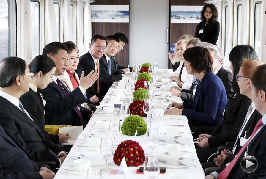 當?shù)貢r間1月15日,國家主席習(xí)近平在瑞士聯(lián)邦主席洛伊特哈德陪同下,乘坐瑞士政府專列自蘇黎世前往瑞士首都伯爾尼。在專列行進過程中,習(xí)近平和夫人彭麗媛受洛伊特哈德主席夫婦邀請,在輕松愉快的氛圍中品茶暢談。