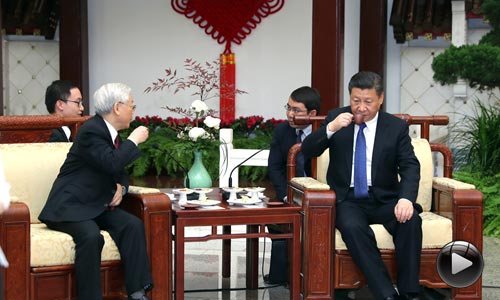 1月12日,中共中央總書記、國家主席習(xí)近平在人民大會堂同越共中央總書記阮富仲舉行會談,指出中越兩國都是共產(chǎn)黨領(lǐng)導(dǎo)的社會主義國家,是具有戰(zhàn)略意義的命運共同體。在兩黨兩國幾代領(lǐng)導(dǎo)人精心培育和大力推動下,中越兩國人民結(jié)下了“同志加兄弟”的友誼。會談后,兩黨總書記進行了茶敘,暢談中越共通的茶文化,共敘兩黨兩國關(guān)系未來。