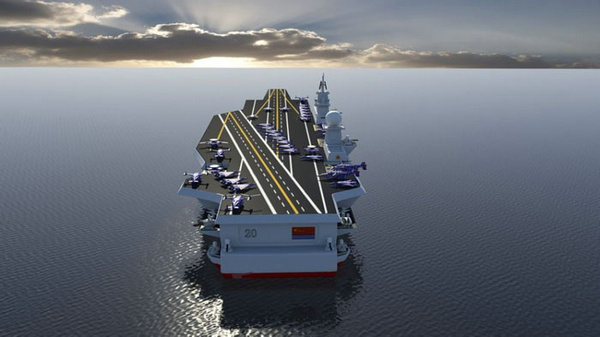 據(jù)美媒報道,在中國首艘國產(chǎn)航母之后,解放軍將迎來003型核動力航母。報道稱,003型航母本身排水量約為9萬噸至10萬噸,搭載70至100架直升機和固定翼飛機,并具有多個飛機升降舵和一個超級艦島。報道還指出,水下護航方面,護航潛艇可能是095型攻擊型核潛艇。資料圖:中國核航母想象圖。