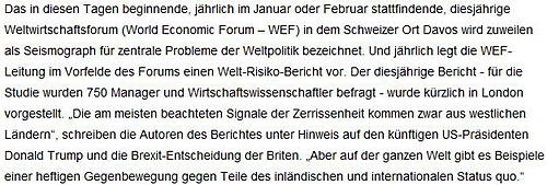 于每年年初舉辦的世界經(jīng)濟(jì)論壇年會(WEF)近日在瑞士小鎮(zhèn)達(dá)沃斯召開,該年會有時也被比喻作世界重大政治問題的“測振儀”。每年世界經(jīng)濟(jì)論壇都會在年會召開前夕發(fā)布一份《全球風(fēng)險報告》。今年的報告于不久前在倫敦發(fā)布,這份報告的數(shù)據(jù)來自對750名經(jīng)理人和經(jīng)濟(jì)學(xué)家所做的問卷調(diào)查。報告在提到唐納德·特朗普當(dāng)選美國總統(tǒng)和英國決定脫歐時稱,“雖然這些最引人注目的分裂信號均出現(xiàn)在西方國家,但在全球范圍內(nèi)還有一些事件表明,人們對國內(nèi)和國際現(xiàn)狀的各方面產(chǎn)生了強(qiáng)烈的不滿!