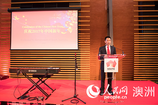 中國(guó)駐阿德萊德代總領(lǐng)事梅運(yùn)才向來(lái)賓們致以新春的問(wèn)候和良好祝福。他在致辭中表示,春節(jié)不僅僅是中國(guó)人民的重要傳統(tǒng)節(jié)日,也日益受到澳大利亞人民的喜愛(ài)。這是總領(lǐng)館設(shè)立后舉辦的第一次春節(jié)招待會(huì),具有特別意義的是,南澳州政府與總領(lǐng)館聯(lián)合主辦這次活動(dòng),體現(xiàn)了南澳州政府重視對(duì)華關(guān)系、尊重中華傳統(tǒng)文化以及對(duì)總領(lǐng)館工作的大力支持。春節(jié)是闔家團(tuán)聚的日子,也是回顧展望的日子;厥2016年,中澳關(guān)系取得豐碩成果。中澳自貿(mào)協(xié)定生效一年多來(lái),中澳務(wù)實(shí)合作達(dá)到前所未有的水平,雙方貿(mào)易額大幅增長(zhǎng),為兩國(guó)帶來(lái)了互利雙贏,也有力地推動(dòng)了兩國(guó)人文交流與合作。