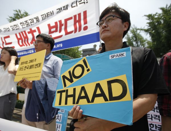 資料圖片:韓國市民團(tuán)體高舉標(biāo)語反對韓美在韓部署“薩德”系統(tǒng)。新華社記者姚琪琳攝