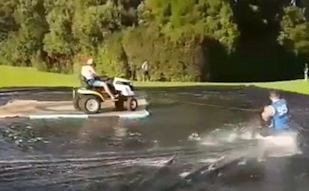 據(jù)英國《每日郵報》1月19日報道,新西蘭漢密爾頓的兩個男子利用割草機(jī)和一大塊防水布打造了一個“滑冰場”。他們將一大塊防水布鋪在草地上,割草機(jī)放在中央,并把一根滑雪纜繩綁在上面,在割草機(jī)的帶動下,人抓著繩子就可以在防水布上自由滑動。