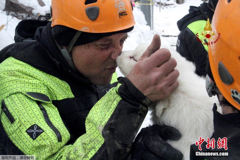 當(dāng)?shù)貢r(shí)間1月23日,意大利救援人員在被雪掩埋的酒店附近找到三只被埋的狗寶寶。三個(gè)呆萌小家伙的獲救讓工作人員喜出望外,熱情地對(duì)它們又抱又親。意大利中部的一處滑雪度假酒店當(dāng)?shù)貢r(shí)間1月18日遭到雪崩掩埋,造成賓館內(nèi)超30人失蹤。