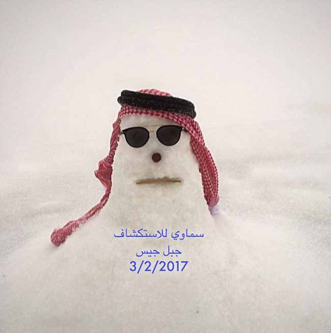 國(guó)際在線專稿:據(jù)英國(guó)《每日郵報(bào)》2月5日?qǐng)?bào)道,一直被人們視作全年烈日的阿聯(lián)酋近日氣溫驟降,跌破零下2度。多地遭暴雪侵襲,降雪量可達(dá)10厘米。在距離迪拜車程不到1小時(shí)的哈伊馬角,一個(gè)戴阿拉伯頭巾的酷炫雪人成為人們爭(zhēng)相拍照的熱點(diǎn),這個(gè)雪人也就此成了“網(wǎng)紅”,在推特上被瘋狂轉(zhuǎn)發(fā)。
