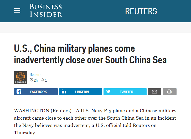 【環(huán)球網(wǎng)綜合報道 】據(jù)英國路透社2月10日報道,一名美國官員9日告訴路透社稱,美國海軍一架P-3巡邏機(jī)和一架中國軍機(jī)于2月8日在南海上空接近,美國海軍認(rèn)為,此事件并非故意。CNN報道稱,中方軍機(jī)為空警200預(yù)警機(jī)。