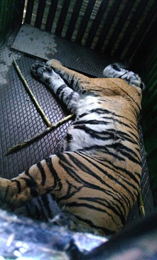 當?shù)卮迕耖_著拖拉機壓平農(nóng)作物,為搜尋老虎開辟道路。護林員騎著大象展開搜尋工作。人們發(fā)現(xiàn)老虎時它正在撕咬一名男子,男子失去了一只胳膊和一條腿,并且已經(jīng)死亡。老虎試圖攻擊村民并逃跑,搜尋人員發(fā)射了幾十枚鎮(zhèn)定飛鏢后,老虎才失去意識并倒下。