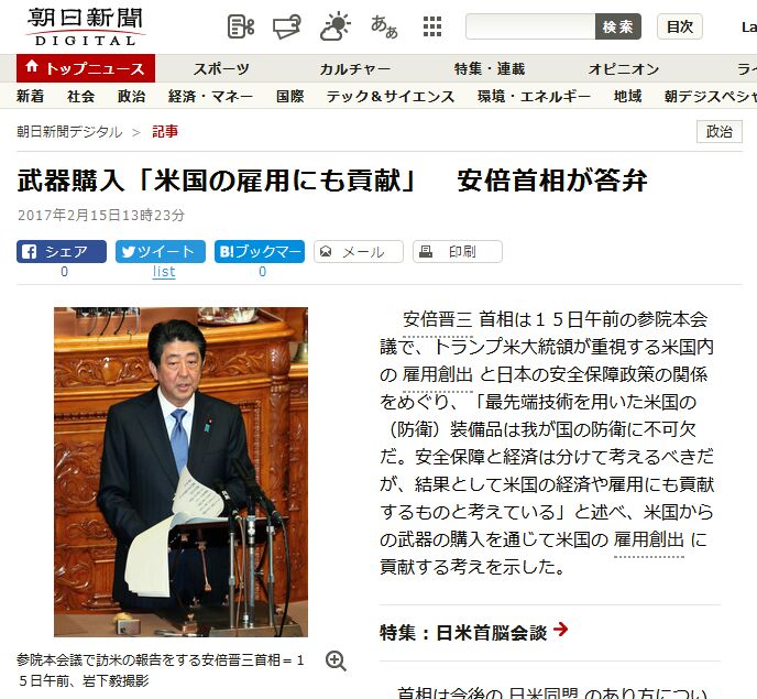【環(huán)球網(wǎng)報道 記者 余鵬飛】據(jù)日本《朝日新聞》2月15日報道,針對美國總統(tǒng)特朗普重視的國內(nèi)就業(yè)和日本安保政策的關(guān)系,日本首相安倍晉三在15日上午的參議院會議上表示,購買美國最先進(jìn)的武器裝備對日本的防務(wù)而言不可欠缺,而且還可以為美國的經(jīng)濟(jì)及就業(yè)問題做出貢獻(xiàn)。
