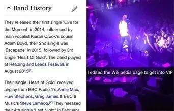 亞當(dāng)和他的朋友來自英國柴郡克魯鎮(zhèn),他們于2月10日去往曼徹斯特的艾伯特廣場觀看演唱會(huì),卻因火車延誤遲到而沒有獲得心儀的座位,于是亞當(dāng)計(jì)劃冒充樂隊(duì)成員家屬,設(shè)法進(jìn)入VIP觀看區(qū)。為了向門衛(wèi)證明自己就是樂隊(duì)家屬,他編輯了維基百科的相關(guān)詞條頁面,謊稱自己是夏洛克樂隊(duì)的主唱卡倫·克魯克的表親。門衛(wèi)相信了亞當(dāng),并允許他進(jìn)入了貴賓區(qū)域。