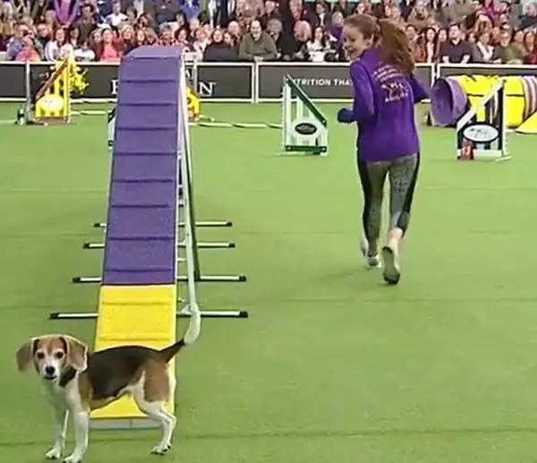 隨后,更滑稽的一幕出現(xiàn)了。當(dāng)面對陡坡障礙時(shí),米婭果斷掉頭離開。在米婭結(jié)束比賽后,犬展解說員打趣道:“真是‘讓人眼前一亮’的‘精彩’表現(xiàn)!”