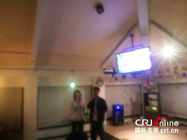 在金剛山旅游時(shí),當(dāng)?shù)氐牟蛷d里師生聚餐,屏幕對(duì)面是餐桌