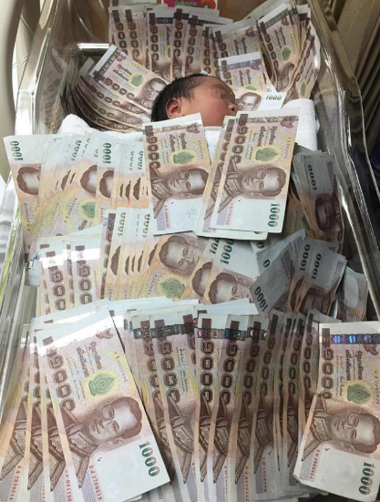 現(xiàn)在炫富的方式真是無(wú)力吐槽,泰國(guó)一個(gè)剛剛出生的孩子,他的土豪阿姨就送來(lái)了200萬(wàn)泰銖(約40萬(wàn)元人民幣)現(xiàn)金作為出生禮物。并且把這些1000泰銖(約200元人民幣)面值的紙幣當(dāng)被子蓋在嬰兒身上。嬰兒蓋40萬(wàn)現(xiàn)金睡,嘖嘖~這土豪花樣炫富雖然富貴氣十足,但卻遭來(lái)了無(wú)數(shù)網(wǎng)友的一片吐槽聲:“你有錢也不用這么曬吧,有沒(méi)有考慮過(guò)小孩的感受!