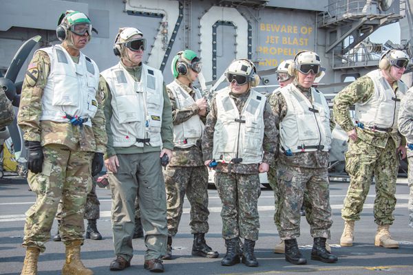 韓聯(lián)合參謀本部議長李淳鎮(zhèn)(左四)和美韓聯(lián)合司令部司令布魯克斯(左一)登上“卡爾·文森”號(hào)航母。