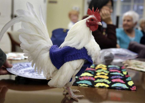 中新網(wǎng)3月14日電 據(jù)外媒報道,美國麻州米爾頓市富樂村退休老人之家的編織俱樂部成員,聽到今年冬天附近農(nóng)莊的雞群,有些是來自馬來西亞等較溫暖的國家,很不適應(yīng)美國東北部的寒冬,就決定一起替雞織毛衣,幫雞保暖。
