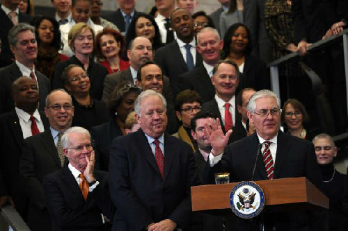 資料圖片:美國(guó)務(wù)卿雷克斯·蒂勒森(前右) 新華社記者殷博古攝