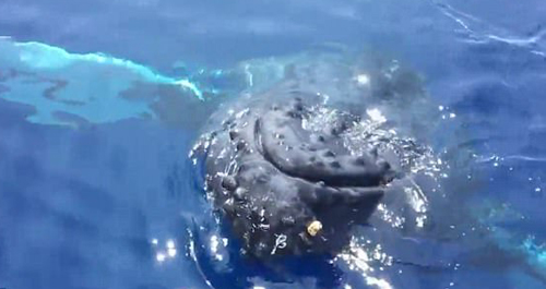 3月13日,當一個巨大的座頭鯨在靠近一只船時,船上觀看鯨魚的人肯定會覺得不虛此行。它在水面上停留了幾秒鐘,回到海洋,之后更接近船身。這一次,游客可以清楚地看到這頭座頭鯨,當該座頭鯨通過清澈的藍色水看著人類時,游客甚至能與其進行眼神交流。鯨魚移動時,抬起魚鰭露出水面,仿佛是在游走前向船上震驚不已的觀眾打招呼。