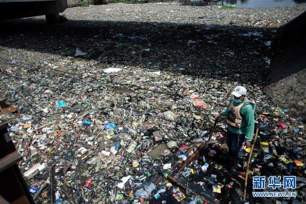 3月18日,在菲律賓馬尼拉的布拉干,一名工人在清理馬里勞河里的垃圾。 新華社/法新