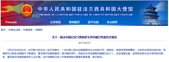 中新網(wǎng)3月27日電 中國駐法國大使館27日在其官方網(wǎng)站通報《關(guān)于一旅法中國公民與警察發(fā)生沖突被打死案有關(guān)情況》,稱3月26日在巴黎19區(qū),一名中國人因與法國警察發(fā)生沖突被打死。中國駐法國大使館立即啟動領(lǐng)保應(yīng)急機制,聯(lián)系法國警方了解情況,要求其盡快查明真相。