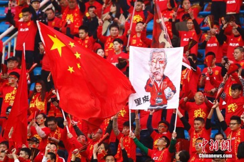 上周,國足在主場戰(zhàn)勝韓國隊(duì),現(xiàn)場觀眾擎起中國隊(duì)主教練里皮的漫畫像。 中新社記者 富田 攝
