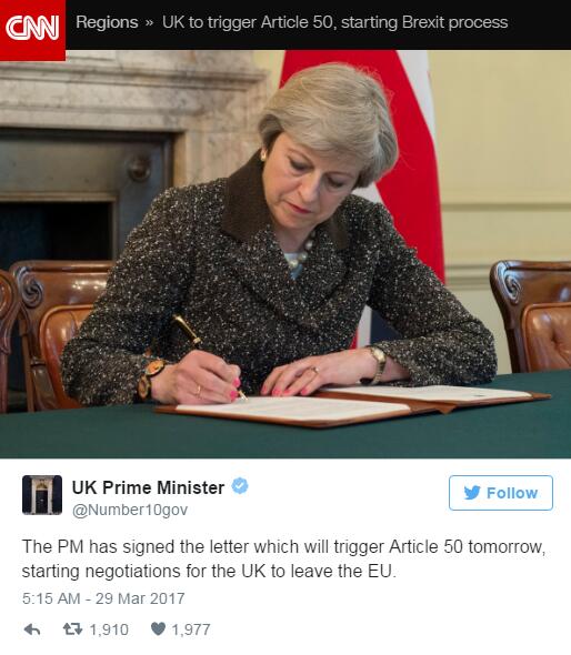 【環(huán)球網(wǎng)報道 記者 王一】據(jù)美國有線電視新聞網(wǎng)3月28日報道,英國首相特雷莎·梅28日簽署歷史性的信函,將在29日交給歐盟,啟動英國脫離歐盟程序。