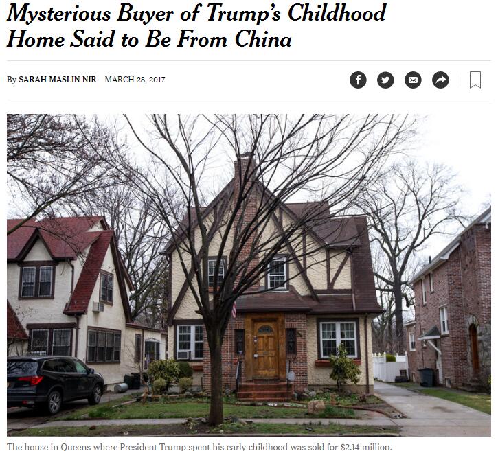 報(bào)道說,買家身份被隱藏在一家成立不久,名為“特朗普出生屋”( Trump Birth House)的有限責(zé)任公司之后。本次交易于3月23日達(dá)成,由一位專門引導(dǎo)海外華人買家投資房地產(chǎn)的律師推動,他名叫邁克爾·X·唐(Michael X. Tang,音),同時也是“特朗普出生屋”公司的代表律師。他說自己無權(quán)披露有關(guān)這起交易的任何信息。