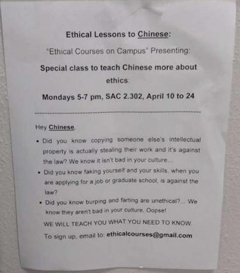 辱華布告的標(biāo)題為“給中國(guó)人上的道德課”,其中“中國(guó)人”一詞下面還加上了用于表示強(qiáng)調(diào)的下劃線。布告寫(xiě)道:“中國(guó)人,你們知道復(fù)制別人的知識(shí)產(chǎn)權(quán)實(shí)際上是偷竊別人的成果并且是違法的嗎?我們知道在你們的文化這么做不是壞事……當(dāng)你們?cè)谡夜ぷ骰蛏暾?qǐng)研究生院的時(shí)候,你們知道在你們的信息和技能上作假是違法的嗎?” 此外,文中還指責(zé)中國(guó)人知不知道打嗝和放屁是“不道德的”,文中稱,“我們知道在你們的文化中這么做沒(méi)關(guān)系......哎喲!”