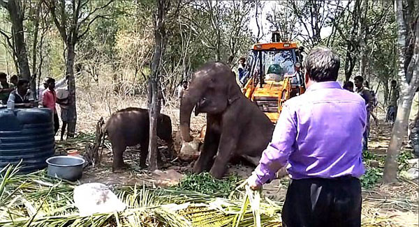 4月8日上午,巡邏隊發(fā)現(xiàn)了它們,連忙向上級匯報情況。接著,醫(yī)護(hù)人員、村民、森林看護(hù)員等都來到了現(xiàn)場,約30瓶葡萄糖和止痛藥也被送了過來。人們花了21個小時來治療這只大象,期間也給它和象寶寶喂了許多食物,確保它們不再挨餓。4月9日下午3點,在拖拉機(jī)的幫助下,象媽媽成功站了起來,引來周圍歡呼聲不斷。