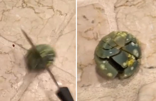 這枚色彩繽紛的雞蛋在9年前復(fù)活節(jié)的“尋找彩蛋”游戲中被遺忘在沙發(fā)坐墊下,直至今天才被發(fā)現(xiàn)。在這段令人反胃的視頻中,在Reddit McReddit搖了搖雞蛋后,能聽到有東西在里面翻滾,他說道“里面已經(jīng)變成一個(gè)皮球了!崩^而用刀敲開9歲的雞蛋殼,露出里面一個(gè)奇形怪狀、腐爛的腫塊。