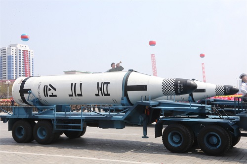 4月15日在朝鮮首都平壤舉行的閱兵式上拍攝的“北極星—2”型潛射中程彈道導(dǎo)彈。新華社記者朱龍川攝
