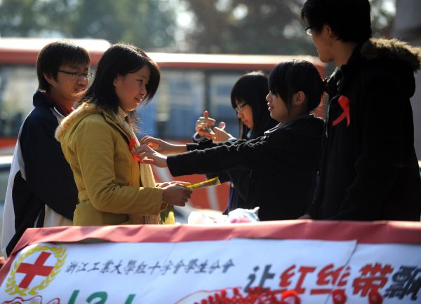 資料圖:2008年12月1日世界艾滋病日,浙江工業(yè)大學的志愿者們?yōu)橥瑢W帶上“紅絲帶”。新華社記者徐昱攝